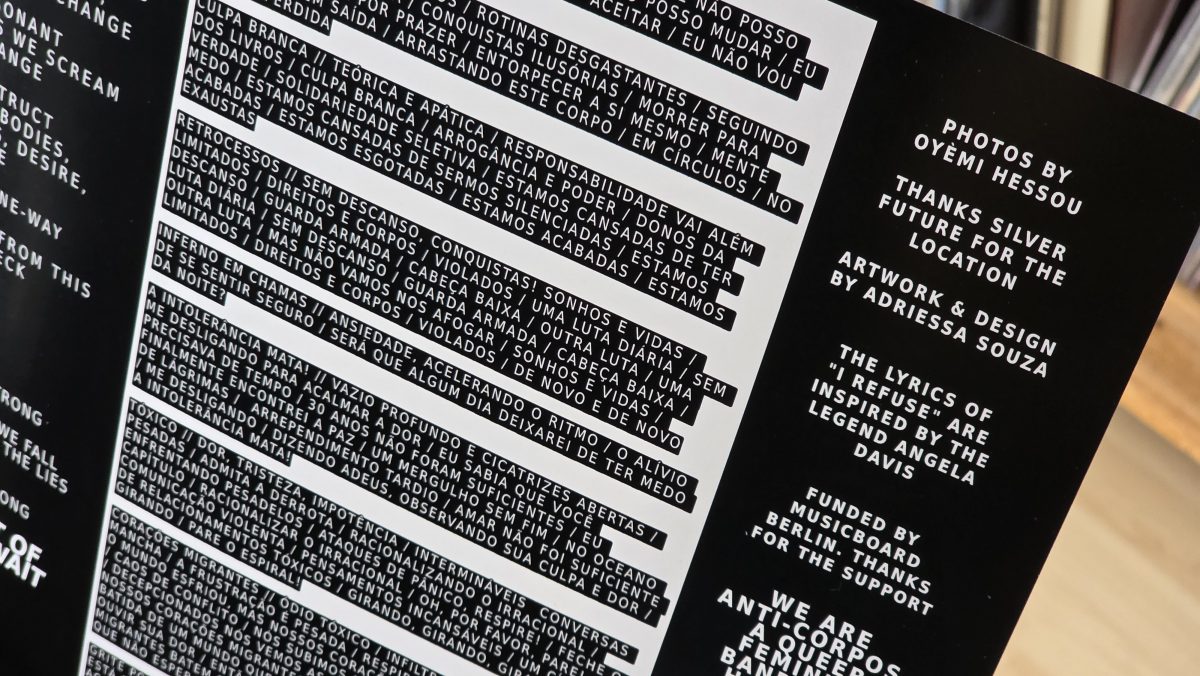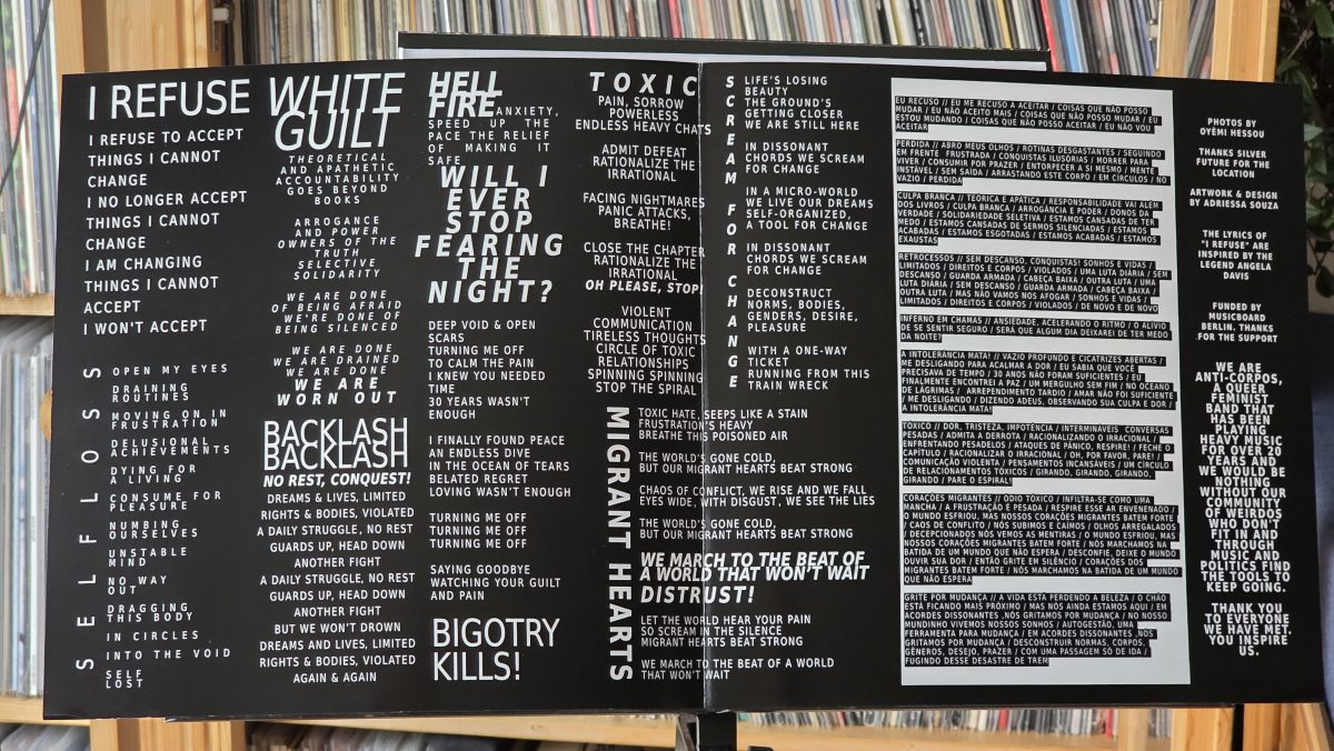 Der Sound ist richtig heavy und maximaler Output. Abwechslungsreich in den Vocals. Inhaltlich, „backlash“ bedeutet Gegenreaktion, ganz klar gegen Männlichkeit, gegen Rassismus und pro feministisch, vor allem aber mit einem Augenmerk darauf, als Südamerikanerinnen hier im weißen Europa unterwegs zu sein.