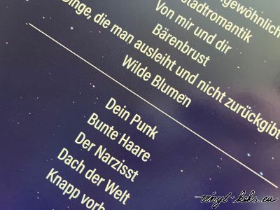Die lila Vinyl läuft sehr schön ohne Knacksen durch. Es bedarf da keiner Plattenwäsche. So mag ich das. Die Platte befindet sich in einem gefütterten Inner Sleeve. Was diesmal leider fehlt und mir persönlich immer wichtig ist, sind die Texte.