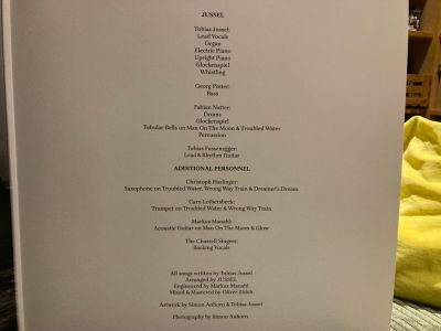Komplettiert wird die Band durch Fabian Natter an den Drums und sonstigem Schlagwerk, Georg Pinter am Bass und Tobias Fussenegger an der Gitarre. Gäste gab’s auch, als da wären Christoph Haslinger am Saxophon, Caro Loibersbeck an der Trompete, Markus Manahl an der Akustikgitarre und The Chassell Singers mit ihren tollen Backing Vocals. Sie alle zusammen umrahmen also den Gesang von Tobias Jussel mit Musik, für die ich nun noch immer (verzweifelt) eine Kategorie suche.