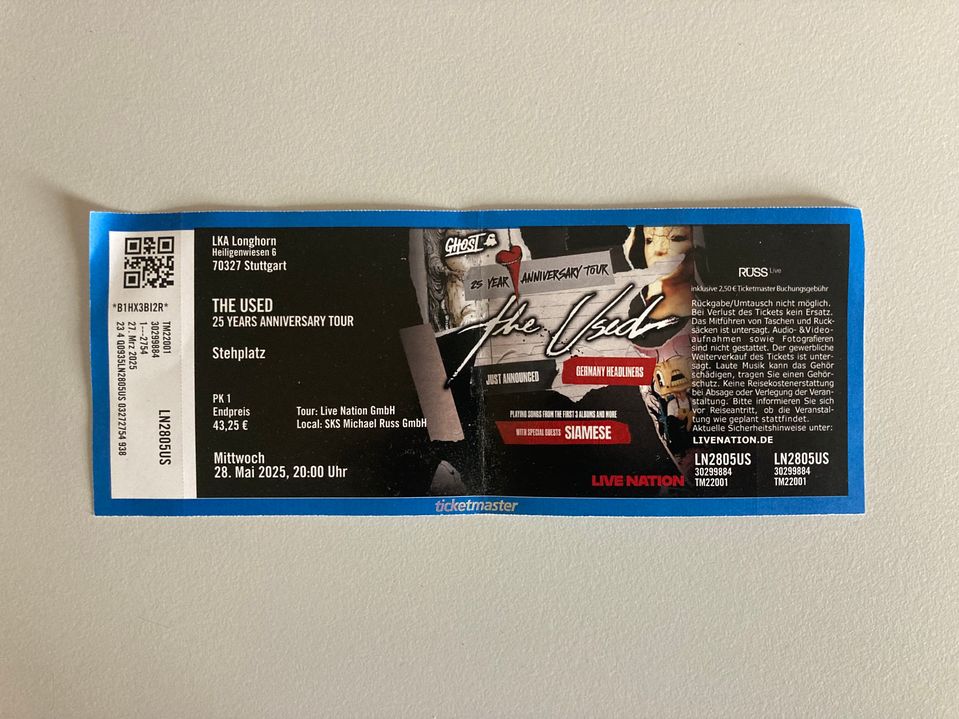 Mittwochabend, 28.05.2025. Wie eigentlich immer mache ich viel zu spät Feierabend, als mich auf dem Nachhauseweg ein Anruf meines Arbeitskollegen (der war schlauer als ich und hatte schon lange Schluß!) Sven ereilt. Er habe da zwei Tickets zum Preis von einem „verpeilten Kifferskateboarddude aus Tübingen“ bekommen, welcher es verpeilt habe, dass er und sein Kumpel aus Leipzig(!!?) doch eigentlich gar keine Zeit hätten heute, um nach Stuttgart ins LKA zu fahren, um dort eine von nur zwei Deutschland-Shows von The Used zu sehen. Und da der gute Sven logischerweise gleich wie ich in diesem unsäglichen sozialen Bereich tätig ist, wolle er mir das quasi Umsonst-Ticket auch umsonst geben.